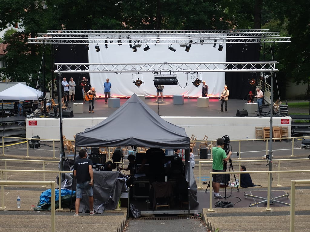 Pour ce spectacle, nous avions en place une douzaine de micros HF regroupant des instruments (guitares, trikki) et chanteurs (micros casques, micros main) afin de limiter les interventions sur scène. Plusieurs couples de micros statiques étaient en place fixe pour les chorales, la partie de théâtre ou encore l’Estudiantina.
